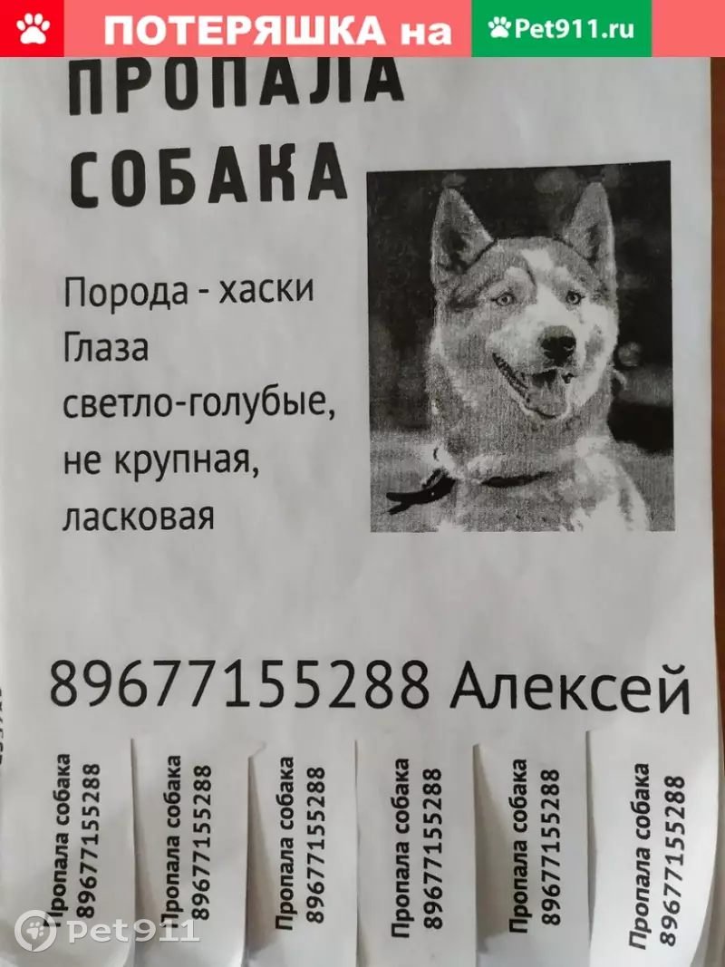 Все еще не найдена собака!!! ХАСКИ, 5 лет, есть клеймо, стерильна. Последний раз дома ее видели 8го января в 6 утра. Соседи сказали, что собаку кто то тащил от нашего дома на веревочке в сторону нариманова в тот же день. Может быть в любом районе города и области!!! Окрас серо-белый, глаза голубые, пол женский. Отличительная черта - на морде одна "бровь" несеметричная полоска!! Будем рады любой информации!