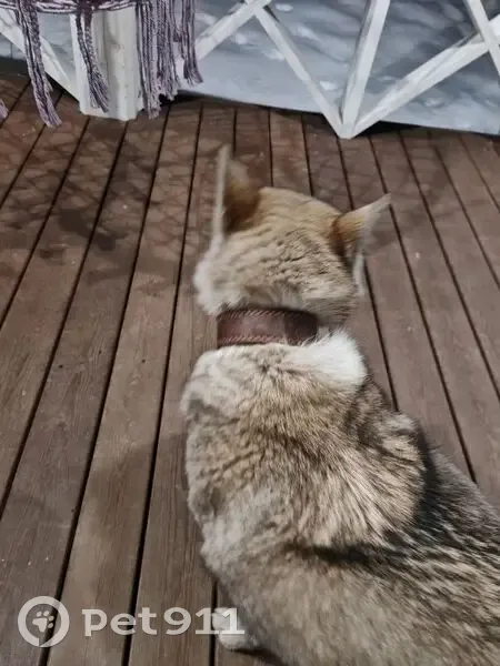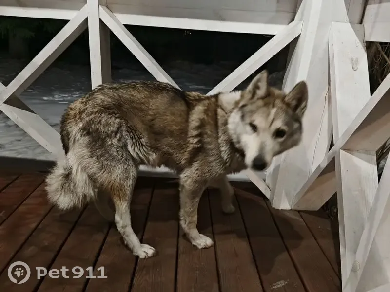 Найдена собака в СНТ Сосновый (20й км Байкальского Тракта). Серый окрас. Средний размер. Подбит правый глаз. Надет добротный широкий коричневый кожаный ошейник. Жмётся к людям, явно домашняя.