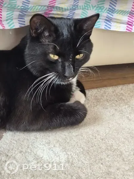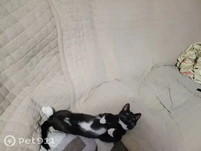 Черно-белый, возраст около года. Кончик хвоста беленький. Ушел на ночь погулять и не пришел утром. К чужим людям не подходит. Что-то с гортанью, мяукать не умеет, может, но совсем тихо.