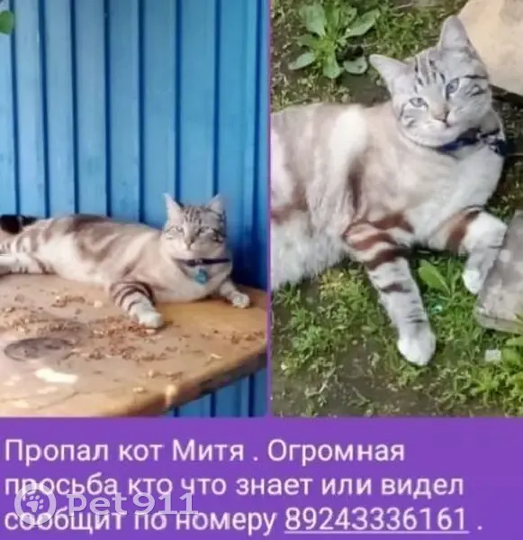 Серенький,полосатый,на животике пятнышки,глаза косоватые,на лбу буква м ,ошейник с мидальенчиком с именем и номерами телефона,откликается на свое имя Митя