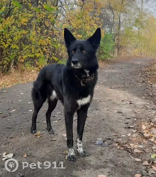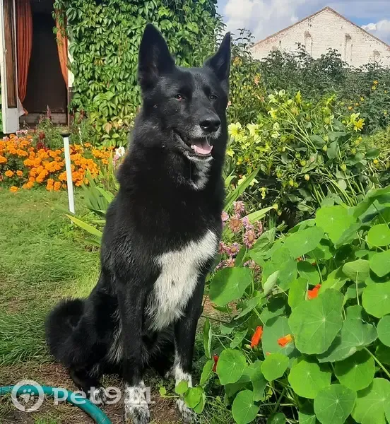Черный окрас, белая грудь и лапы. Похож на лайку.