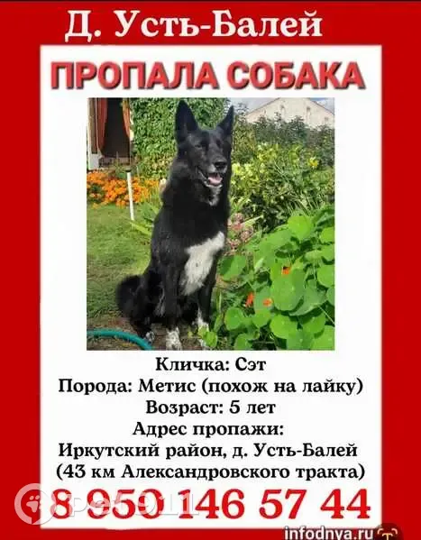 Поиск продолжается! Ищу своего потеряшку! 30 апреля во время штормового убежал с дачного участка д. Усть-Балей (43 км Александровского тракта). 5 лет, домашний пёс, нецепной. Черный окрас, белая грудь и лапы белые "как носочки". Похож на лайку. Уши торчком и хвост колечком. Кличка Сэт. Может вышел на Александровский тракт и убежал в соседние населенные пункты. Или его подобрали и увезли в Иркутск. В отловах его не находила. Важна любая инфо о возможном его местонахождении🙏тел.89501465744 ВОЗНАГРАЖДЕНИЕ