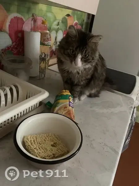 Отзывается на кличку Мурзик.На носу есть черный шрам,лапки белые.Сам окрас серо-черные с белым.