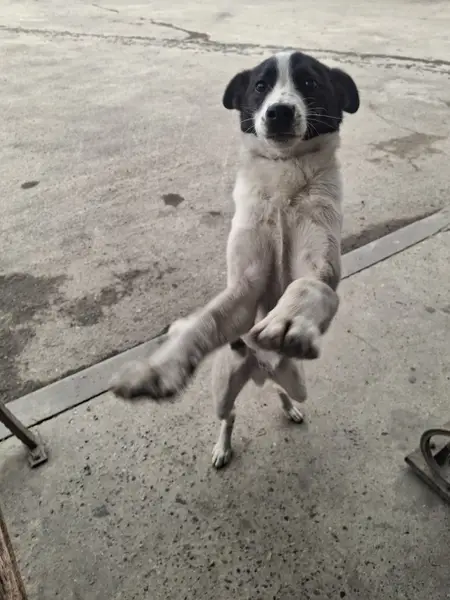 11 месяца.кобель.дружелюбный.с ошейником вышел погулять и не вернулся.окрас белый с черными пятнами