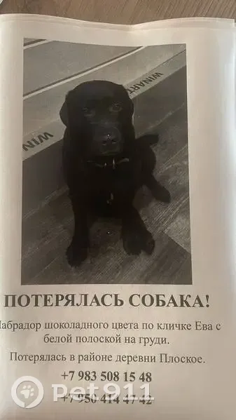 Пошли по грибы, в какой-то момент собака пропала. Возможно объявится на ближайших дачах. Лабрадор, шоколадный окрас, на груди белая полоска. Домашняя, ласковая к людям. Откликается на "Ева", немного глуховата. Людей не боится, спокойная. Вознаграждение гарантируем, пожалуйста помогите найти.