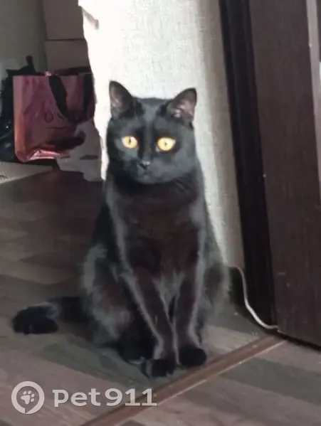 Черный котенок, на задней лапки нет шерсти в двух местах (выглядит , как белый окрас). На спинке небольшая белая полоска, большие жёлтые глаза , рост не большой, примерно средний , не толстый . Убежал пока была открыта входная дверь
