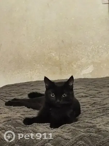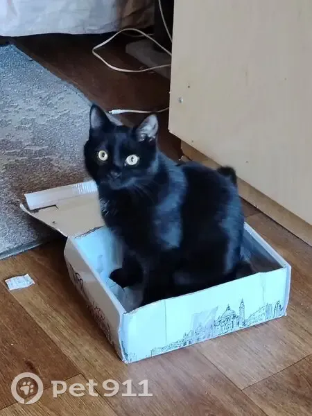 Чёрная кошечка с зелено-жёлтыми глазами. Есть небольшие белые вкрапления на грудке. Небольшая, ей примерно 9-10 месяцев. Незаметно выбежала в подъезд из квартиры, нигде не можем найти её