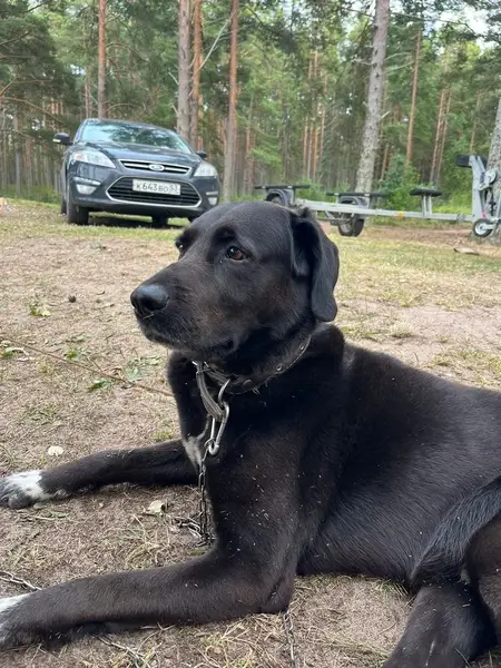 Собака с ошейником на автовокзале, стоянка автобусов, окрас черный