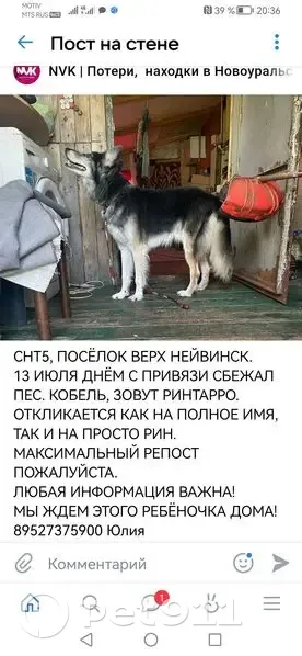 снт5, посёлок верх нейвинск. 13 июля днём с привязи сбежал пес. Кобель, зовут ринтарро. Откликается как на полное имя, так и на просто рин. Мама хаски, папа немец - больше похож на хаски.