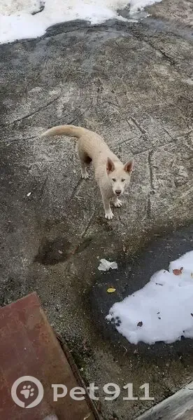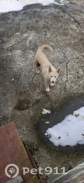 Белый окрас, уши торчком, глаза по цвету разные, один голубой, другой серозеленый(?), порода смесь хаски с(?). Приблудился 07.01.2026г.. Пришёл на Верхний юрт, снт Урожай.