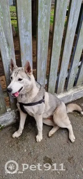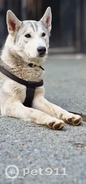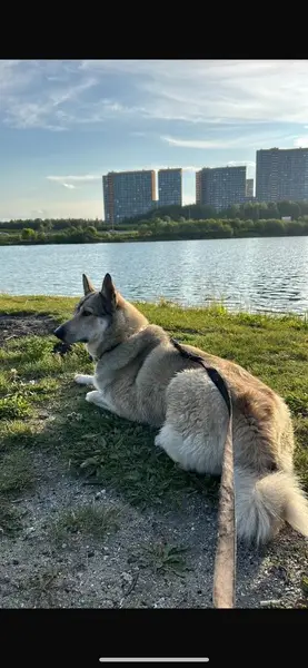 Похожа на западно-сибирскую лайку или метис. За правым ухом как будто полоса от феолетово-розового фломастера. Была в чёрной шлейке и противоблошином ошейнике. Телосложение мускулистое, добрая, ласковая и очень ждёт хозяина!