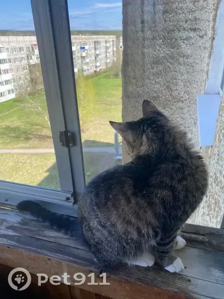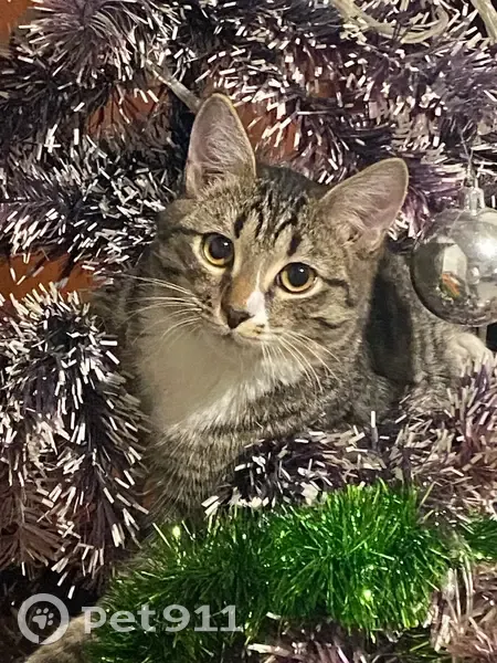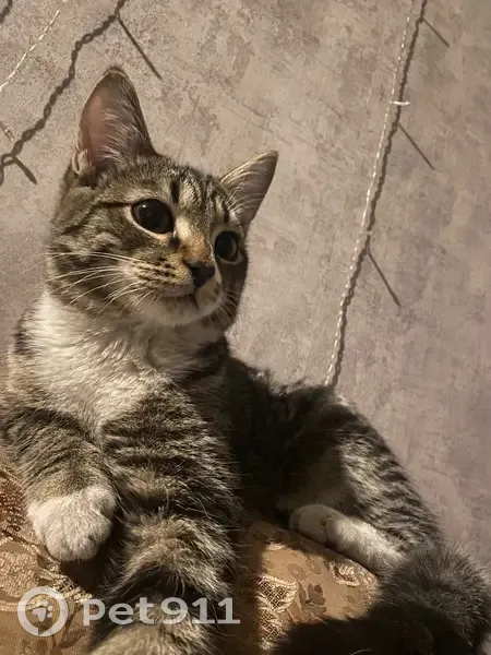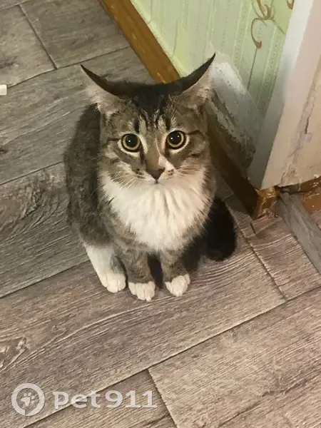 В районе Воронова 12к1 Кличка: Марсель Возраст: 9-10 месяцев Отличительные черты окраса: от макушки до хвоста черная шерсть, по бокам черно-серые полосы и пятна; на всех лапах в полосочку белые носочки; от шеи до хвоста белая шерсть; на носу присутствует белое пятнышко; хвост в полоску, на лбу буква М; есть полосочки от глаз на щеках.
