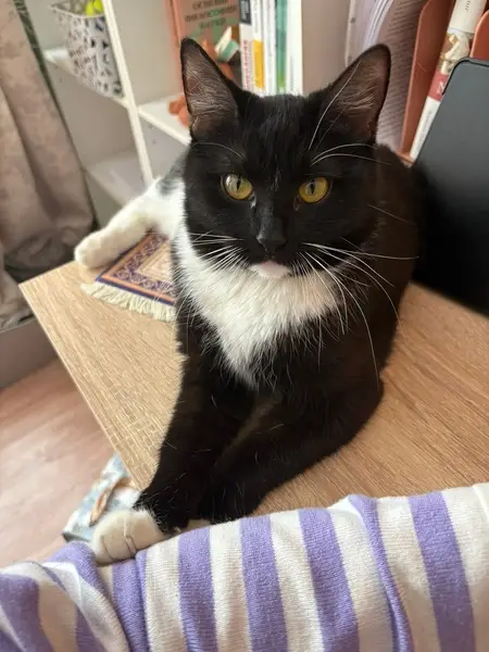 Чёрный кот с белыми пятнами. Плохо ходит, возможно, выпал из окна.