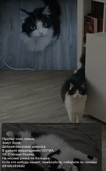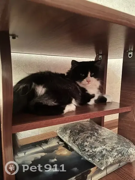 найден кот, черно белой окраски, зеленые глаза, длинная шерстка очень ласковый