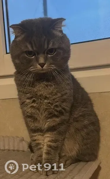 Окрас серо-чёрный-белый шотландец вислоухий мальчик огромные лапы очень пушистый хвост. Пропал он из-за переезда он был очень замкнутый и напуганный и подходил только ко мне.