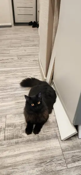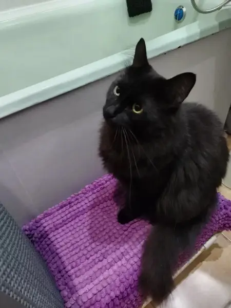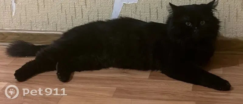 Черный кот. Пушистый. Предположительно 2-2,5 года. Не кастрирован. На носу небольшой шрам. Контактный,спокойный. С утра сидел около дома, «не местный» т. К. Уличных кошек во дворе знаем.Сейчас проходит обработку от паразитов.Очень хочется найти хозяина или добрые руки.