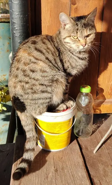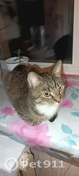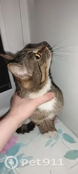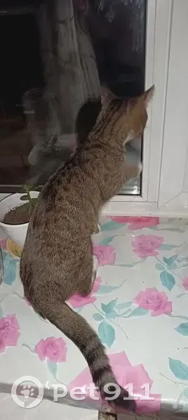 Глаза зелёные. Окраска тигриная, с рыжиной. Нос рыжий. Грудка белая, как и лапки. Очень ласковый и контактный, но извивается и ёрзает постоянно. Крикливый.