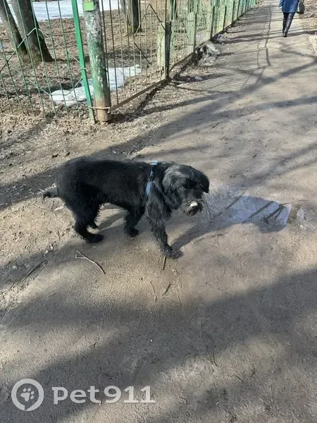 Крупный черный пес, не агрессивный, но и к себе не подпускает, на нем голубая шлейка