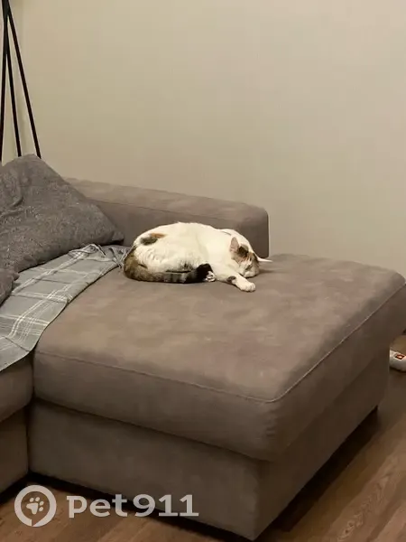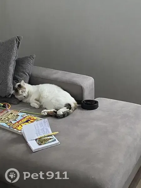 Белая кошка пятнышками на мордочке, на спинке и темным хвостом. Кошке 4 года, домашняя, ухоженная. Везли на дачу, убежала в микрорайоне энергетик, у магазина пятерочка