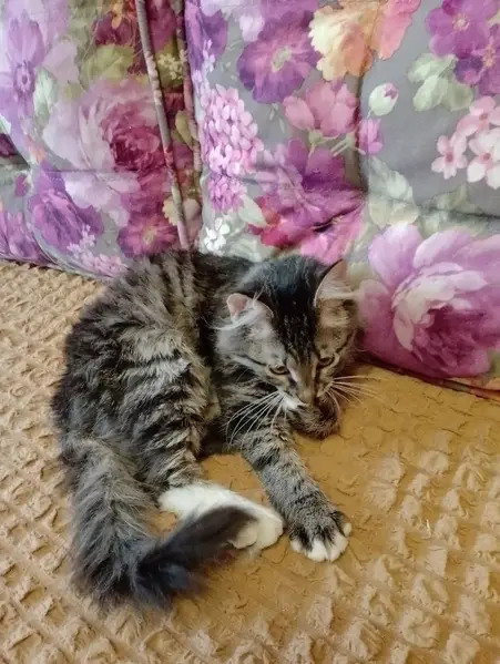 Котенок - девочка, убежала - откликается на кличку Мотя Белая грудка и белые лапки, сама вся серая