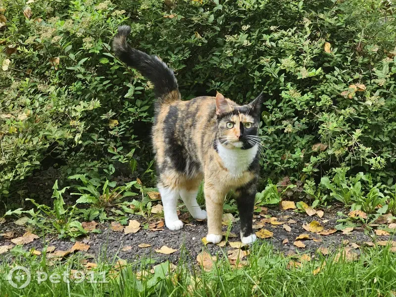 Пятнистая гладкошерстная кошка, рыже-бело-чёрная. На носу чёткая линия, на одной стороне мордочка чёрная, на другой рыжая. Хвостик тёмный, на всех лапках белые «носочки». Кошечка очень пугливая. Видимо, вышла на балкон, пока мы не заметили и соскользнула со второго этажа, куда-то убежала.
