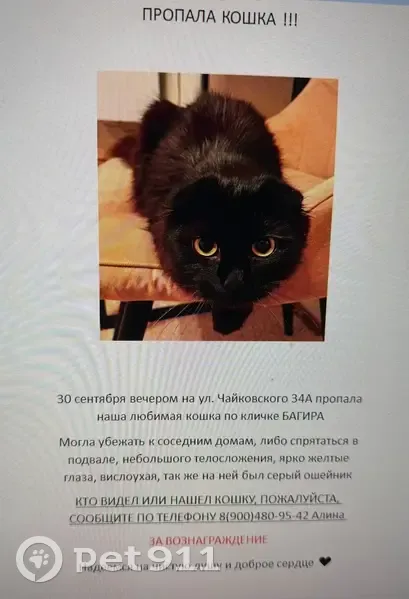 ПРОПАЛА КОШКА 30 сентября вечером на ул. Чайковского 34А пропала наша любимая кошка БАГИРА Могла убежать к соседним домам, либо спрятаться в подвале, небольшого телосложения, ярко желтые глаза, вислоухая, так же на ней был серый ошейник КТО ВИДЕЛ ИЛИ НАШЕЛ КОШКУ, ПОЖАЛУЙСТА, СООБЩИТЕ ПО ТЕЛЕФОНУ 8(900)480-95-42 Алина ЗА ВОЗНАГРАЖДЕНИЕ Надеемся на чистую душу и доброе сердце ️