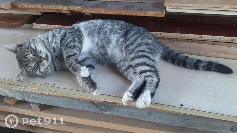 Серый кот, стройный небольшой, не кастрирован, без ошейника, на лапках белые "носочки".