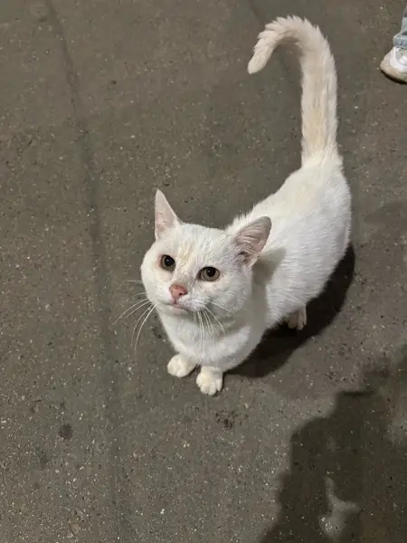 Кошка Белово цвета,хвост серый полосатый,голубые глаза ,белые лапки,серые ушки. Не большого размера