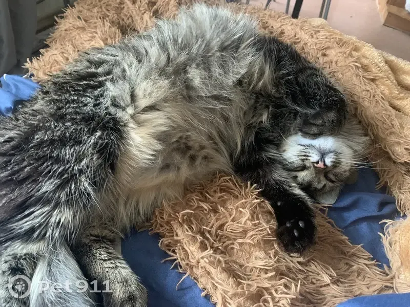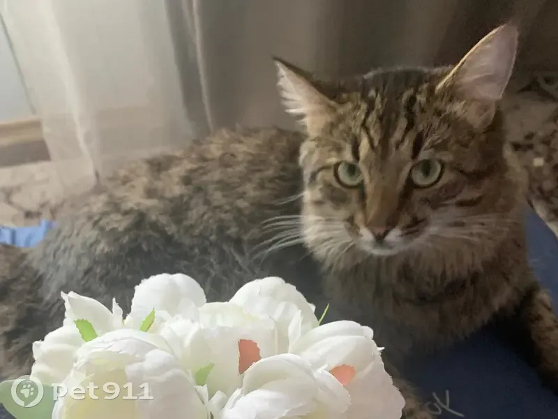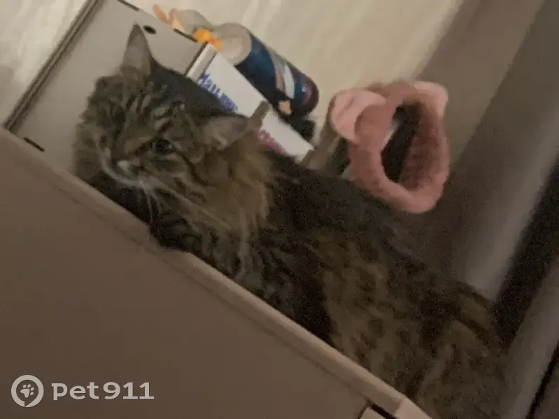 Выбежал из квартиры и видимо испугался чего-то и убежал из подъезда. Окрас серо-коричневый с полосками, большой и очень пушистый, глаза зеленые. Возраст 1,5 года. Характер не агрессивный, в меру игривый, боится незнакомых мест и людей, тихо мяукает
