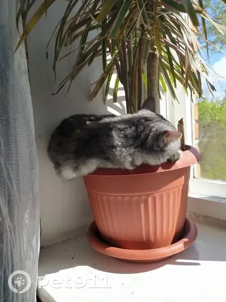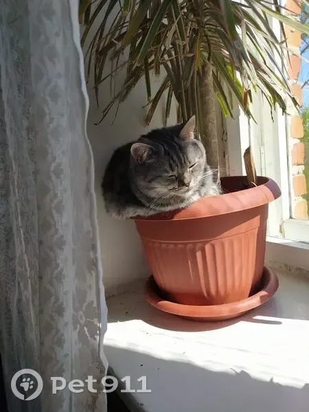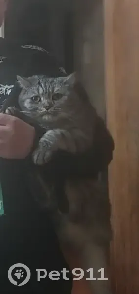 Кошка шотландская прямоухая, помесь. Серого цвета, полосатая, не большого размера. Хвост длинный, закручивается к низу. Характер своенравный. Любит лазить по деревьям. Не заметили, как выскочила в открытую дверь и убежала.