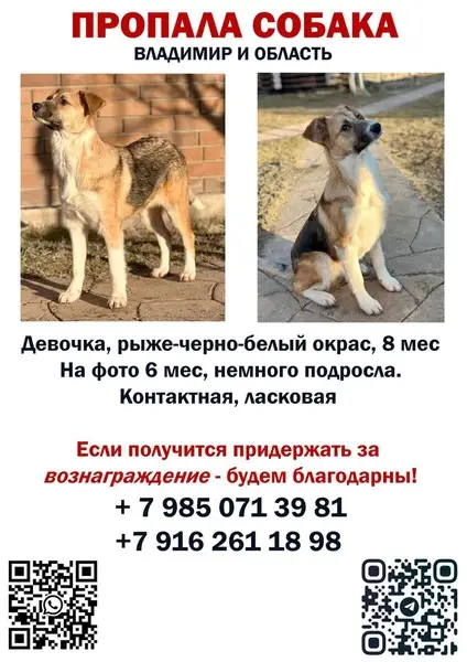 ПОТЕРЯЛАСЬ СОБАКА!!! Суздальский р-н, с. Цибеево. Девочка. Дружелюбная, ласковая. Прекрасно ладит с детьми. Немного шуганная. Примерный возраст 1.5-2 года. ПОМОГИТЕ ПОЖАЛУЙСТА РАСПРОСТРАНИТЬ!!! Контактный номер телефона для связи 8-904-655-26-88 Дарья