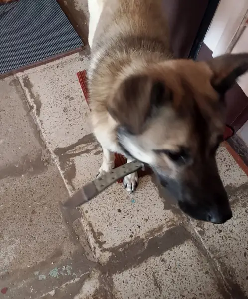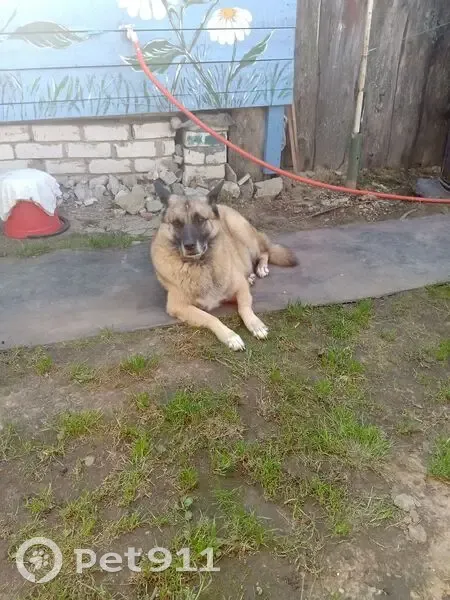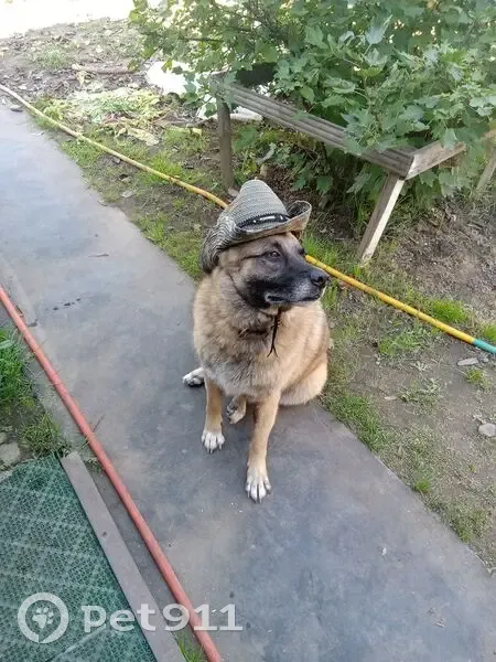 Помесь овчарки и дворняги,ошейник коричневый кожаный проклёпанный. Пёс добрый.