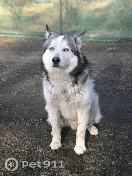 Порода хаски. Серый ошейник. Полностью слепой, поэтому глаза большие чёрные в голубом ободке. Машин не боится. Хорошо относится к женщинам, мужчин побаивается.