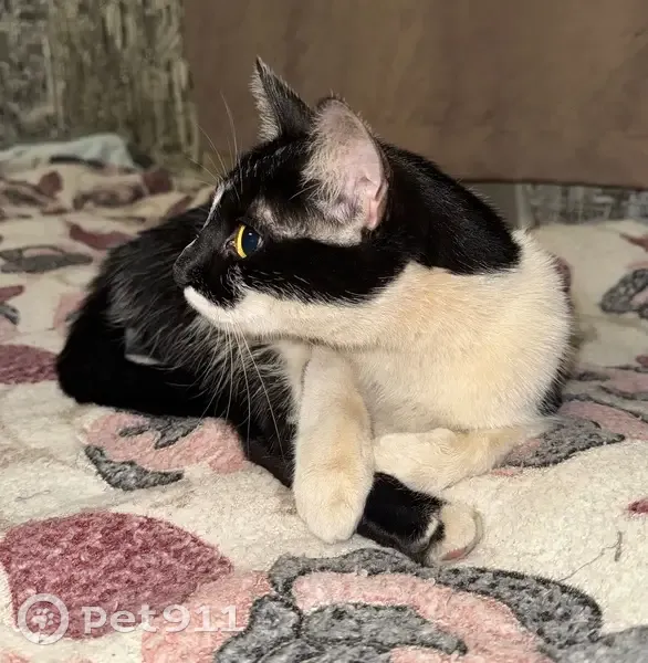 Окрас черно-белый с персиковым отливом. Очень ласковая, спокойная кошечка. Выбежала из неоткуда, дрожала от холода, была голодная. Оставить там не смогли, временно забрали.