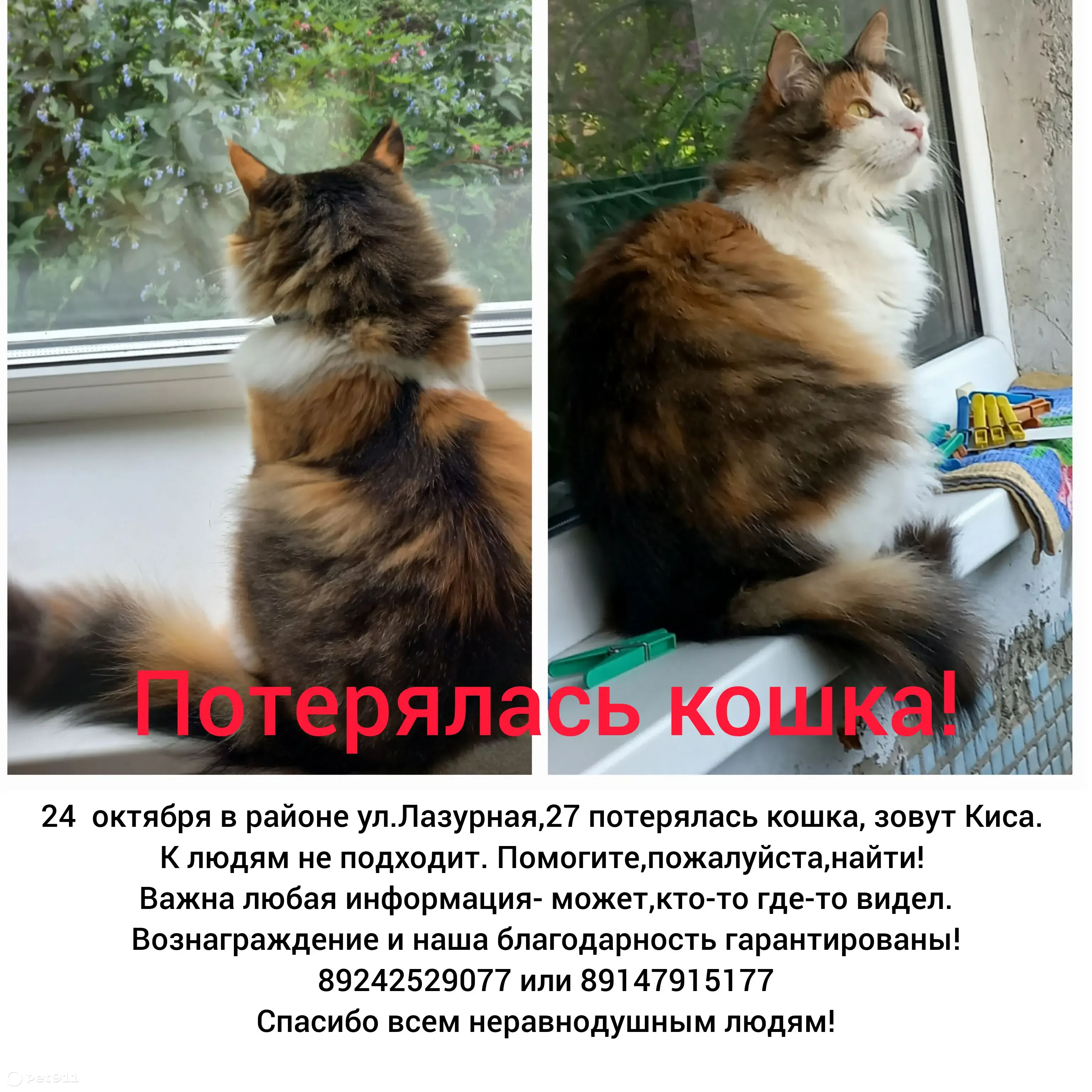 Трехцветная,очень пушистая кошечка. Зовут Киса. К людям не подходит, с рук не ест. После переезда с Надеждинска на Шамору вышла погулять 24.10.2023г. и исчезла. Была в сером ошейнике. Думаем,что могла побежать или в сторону магазина Лазурный , или в обратную сторону по объездной. Нам важна любая информация! Может,кто-то где-то видел. Или,может,она залезла куда-то и мяукает...Помогите,пожалуйста! Вознаграждение и наша благодарность гарантированы! Спасибо всем неравнодушным людям!
