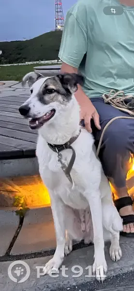 Белая собака, с пятном на глазу и ухе, так же коричневое пятнышко у основания хвоста. Собака крупная, около 25кг, порода похожа на охотничью. Стрижена.