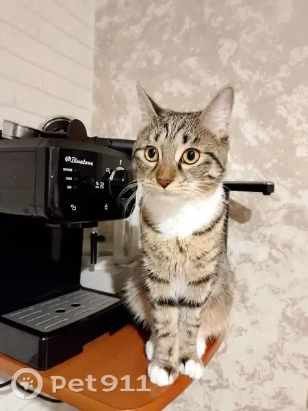 Кошка пятнисто-полосатая, грудка беленькаяна...
