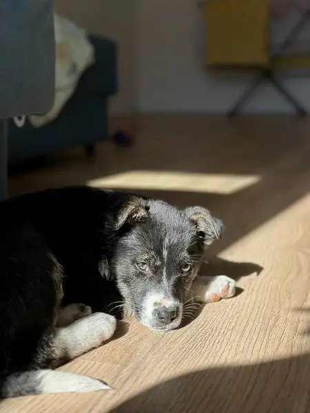 Черная с белой полосой на груди. Уши согнуты, короткошерстная. В розовом ошейнике. Людей боится.
