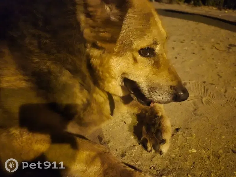 Достаточно большая собака. Либо достаточно откормленная, либо беременная. Спокойная, людей подпускает, в ошейнике коричневом немного потрепанном. Увидели рядом с рынком на 51-й Гвардейской ночью. Лежала спокойно, пить не хотела