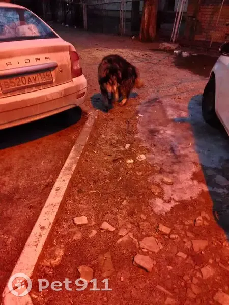 Огромный пёс сидит возле машины. Пол не разглядела, побоялась подойти, была с собачкой. Грязный, агрессии не проявил, окрас черно-рыжий, темно ещё было. Вроде кобель. Чей малыш?