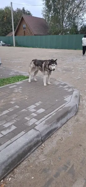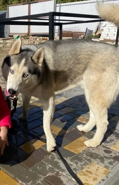 Очень ласковый и добрый пёс. Наверно помесью с хаски. Разноцветные глаза - один голубой, другой карий. Очень красивый окрас. Не кусается и не лает.