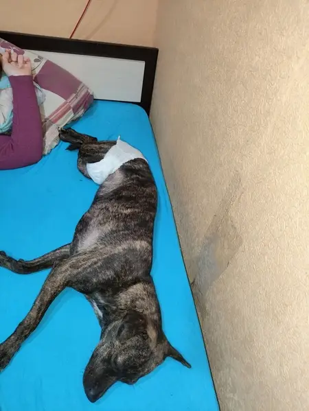 Девочка, окрас коричневый, полосатая морда. Примерно 6-7 месяцев. На шее ошейник синего цвета. Была у церкви «Нечаянная радость». Мы проходили с сыном, и она проявила интерес к ребёнку и увязалась за нами. Прицепили не к поводку, чтобы не попала под машину. На поводке чувствовала себя комфортно. Придя домой она немного покушала и легла спать. Утром у неё хорошее игривое настроение. Аппетит нормальный. С виду здоровья собачка.