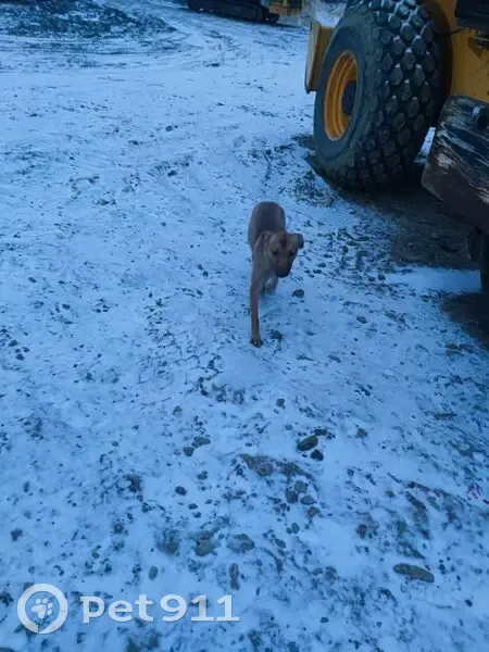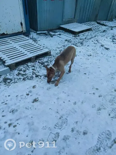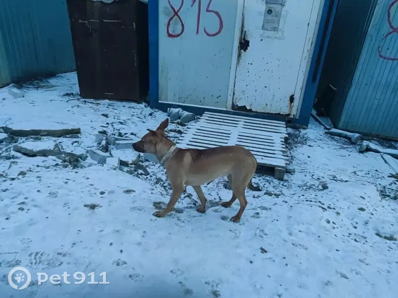 Метис. Наверное, девочка. Светлые оттенки коричневого. Прибежала на стройку, здесь и осталась. Щенок очень контактный, жизнерадостный, умеет играть с людьми. Надет серый кожаный ошейник.