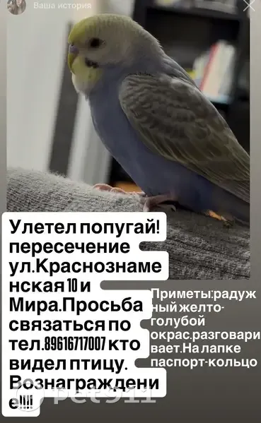 Окрас радужный желто-синий . На лапке кольцо-паспорт . Вылетел с балкона краснознаменской 10