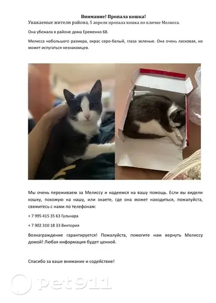 5 апреля пропала кошка по кличке Мелисса. Она убежала в районе дома Еременко 68. Мелисса небольшого размера, окрас серо-белый, глаза зеленые. Она очень ласковая, но может испугаться незнакомцев.