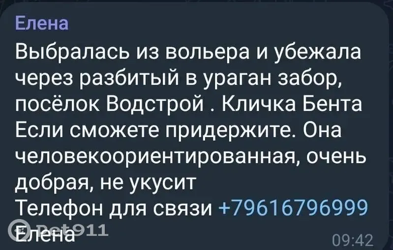 Волгоград. Убежала через разбитый в ураган забор, посёлок Водстрой . Кличка Бента Если сможете придержите. Человекоориентированная, очень добрая, не укусит