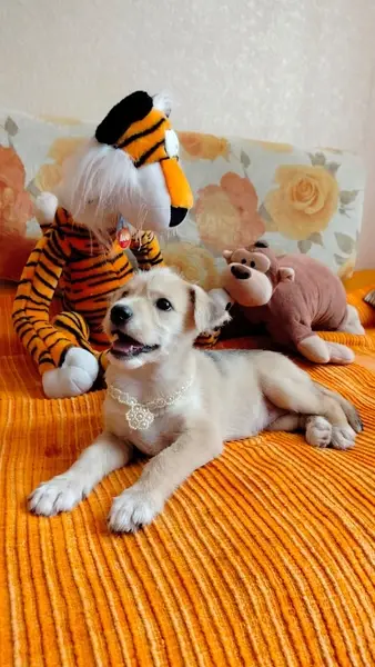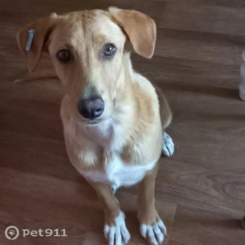 Уличный щенок,подобрала на работе в 5 больнице,подкидыш,приблизительно 8-9 месяцев,чипа на ухе уже нет,т. К. Забрала домой,чипирован в вет. Клинике 9.08.25 г.Микрочип 900263002182368. Скорее песочного цвета,с рыжиной,белая грудь,белые носочки на лапах,длинный,почти до земли,хвост с белым кончиком. Уши висячие,мордочка вытянутая. Шерсть короткая,на лопатках пятна более светлые,как крылышки. Очень боится звуков,особенно людей.Уменя второй месяц,начал привыкать,но громко говорящие люди пугают,поэтому возле дома испугался идущих мужиков,резко дернул,я упала и поводок не удержала. На нем синий ошейник,синяя шлейка и черный круглый поводок 3 м.,с вплетенными белыми нитями и резиновой петлей на конце.