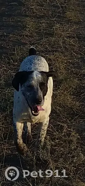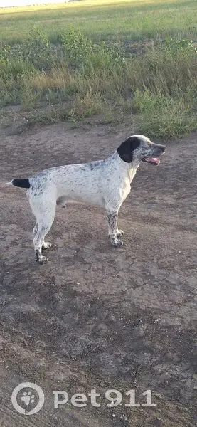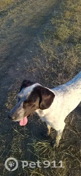 Черно-белая, порода охотничья, предположительно курцхаар, возраст 3-4 года. Прибилась к частному домовладению сама. Была с раной на левом заднем бедре.