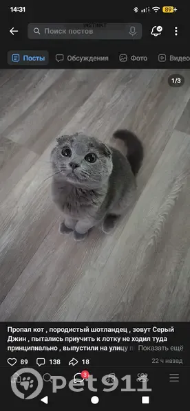 Пропал кот , зовут Серый Джин, породистый Шотландец , уши вислоухие не стоят.. Вес 5-6 кг.. Возраст полтора года.. Глаза жёлтые.. Пропал вечером 9 числа, в районе садика на Пересечении Молодёжной и Авиационной улиц...