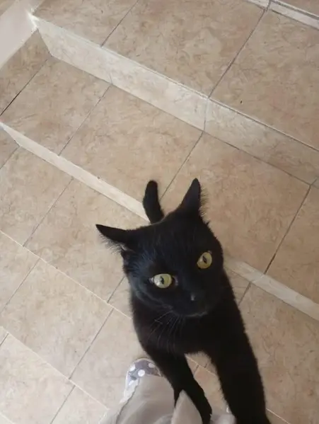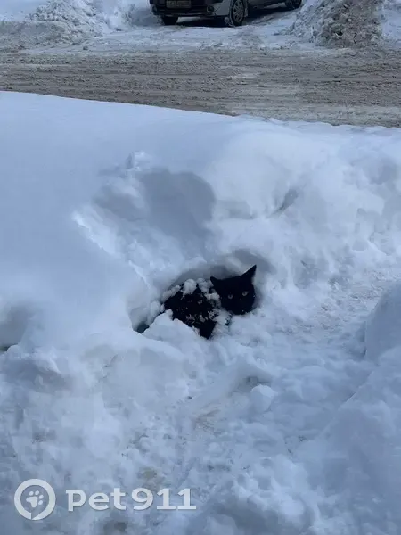 Черный котик, белое пятно на брюшке, карие глаза, был в сугробе завален снегом, громко мяукал и никуда не шел